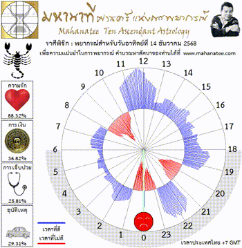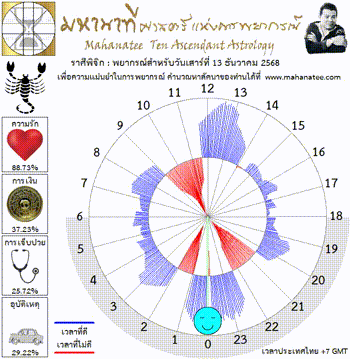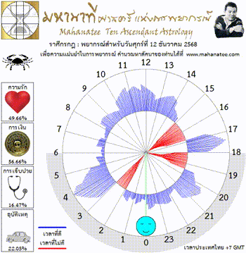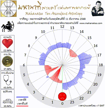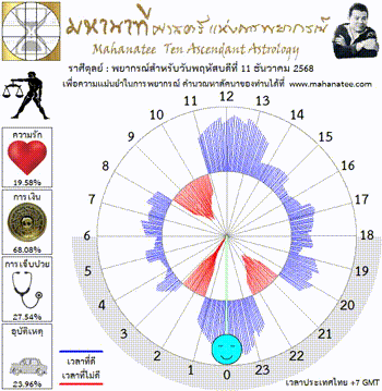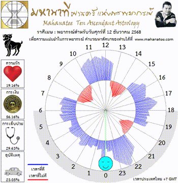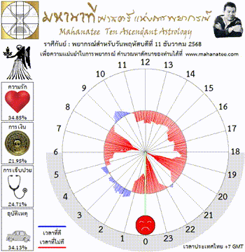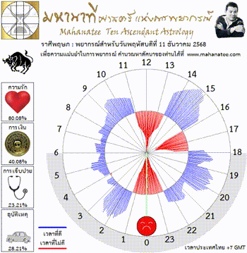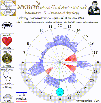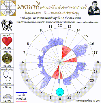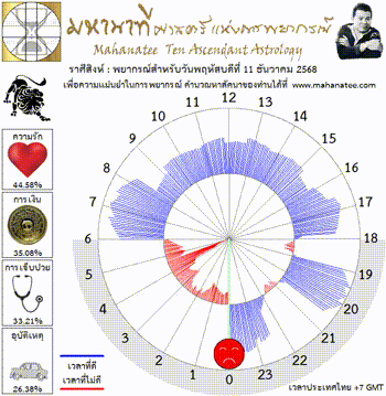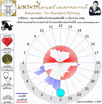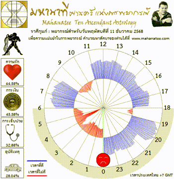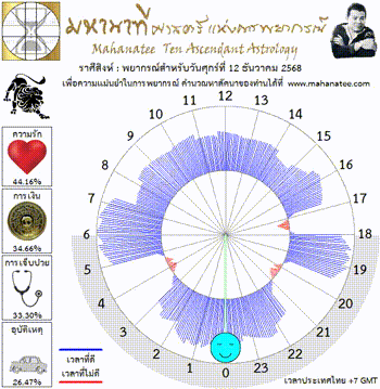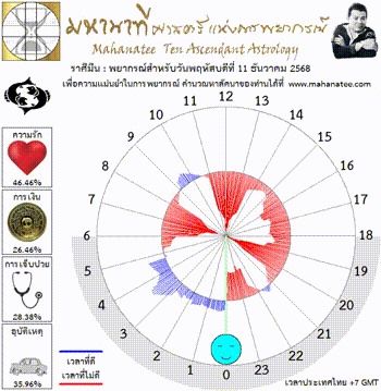 คำนวณหาลัคนาที่ถูกต้องของท่านได้ที่ https://www.mahanatee.com/ และ พยากรณ์พื้นดวงชะตาฟรี ไม่คิดค่าใช้จ่าย แผนภูมิและพยากรณ์ 12 ราศี สำหรับ วันพฤหัสบดีที่ 11 ธันวาคม 2568 เลื่อนไปหาราศีที่ต้องการ และเปิดเสียงด้วย ** หมายเหตุ คลิปจะเล่นได้ 3 วันก่อนวันที่พยากรณ์