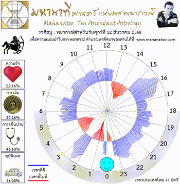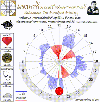 คำนวณหาลัคนาที่ถูกต้องของท่านได้ที่ https://www.mahanatee.com/ และ พยากรณ์พื้นดวงชะตาฟรี ไม่คิดค่าใช้จ่าย แผนภูมิและพยากรณ์ 12 ราศี สำหรับ วันศุกร์ที่ 12 ธันวาคม 2568 เลื่อนไปหาราศีที่ต้องการ และเปิดเสียงด้วย ** หมายเหตุ คลิปจะเล่นได้ 3 วันก่อนวันที่พยากรณ์