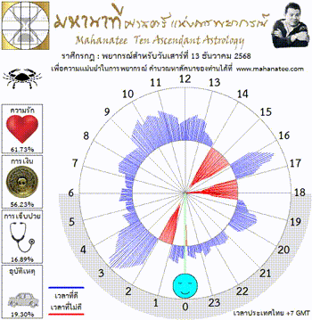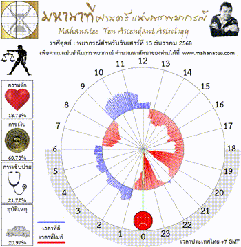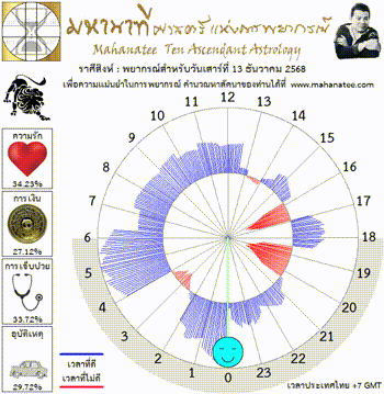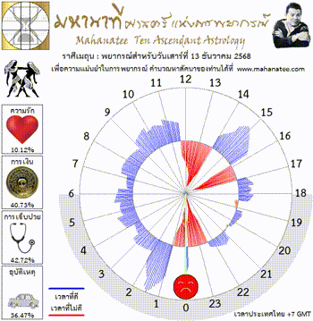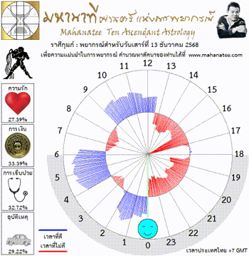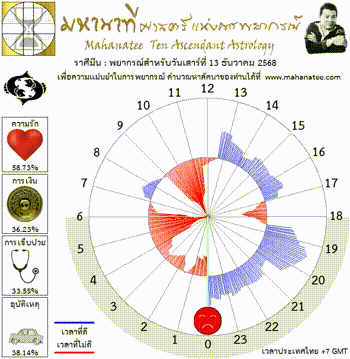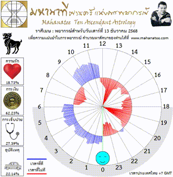 คำนวณหาลัคนาที่ถูกต้องของท่านได้ที่ https://www.mahanatee.com/ และ พยากรณ์พื้นดวงชะตาฟรี ไม่คิดค่าใช้จ่าย แผนภูมิและพยากรณ์ 12 ราศี สำหรับ วันเสาร์ที่ 13 ธันวาคม 2568 เลื่อนไปหาราศีที่ต้องการ และเปิดเสียงด้วย ** หมายเหตุ คลิปจะเล่นได้ 3 วันก่อนวันที่พยากรณ์