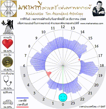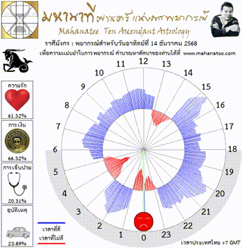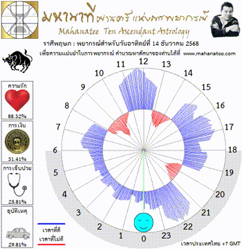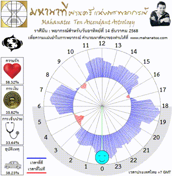 คำนวณหาลัคนาที่ถูกต้องของท่านได้ที่ https://www.mahanatee.com/ และ พยากรณ์พื้นดวงชะตาฟรี ไม่คิดค่าใช้จ่าย แผนภูมิและพยากรณ์ 12 ราศี สำหรับ วันอาทิตย์ที่ 14 ธันวาคม 2568 เลื่อนไปหาราศีที่ต้องการ และเปิดเสียงด้วย ** หมายเหตุ คลิปจะเล่นได้ 3 วันก่อนวันที่พยากรณ์