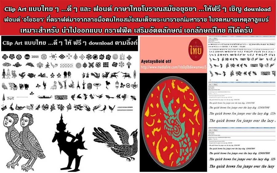 |  | Clip Art แบบไทยๆ ..ดีๆ พร้อม font ไทยโบราณ (ลายมือคนสมัยอยุธยา) ให้ฟรีๆ download ตามลิ้งก์ เที่ยวรอบเกาะรัตนโกสินทร์ [14 ก.ค. 2555 15:56:32 น.]