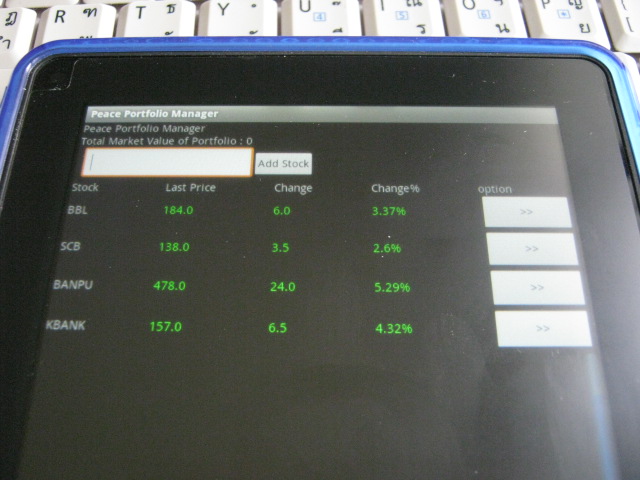 | สำหรับคนเล่นหุ้น Peace Portfolio Manager ดูราคาเคลื่อนไหว บนเครื่องรูทคิลเดิ้ลไฟร์ จ้า NookColor2 [14 มิ.ย. 2555 10:54:25 น.]