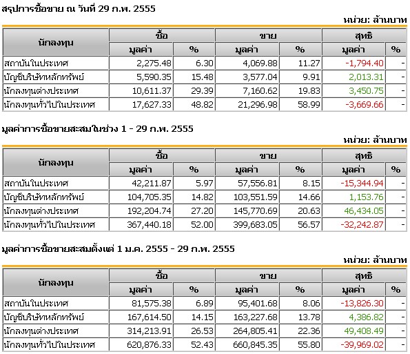 |  | สรุปยอดซื้อขายต่างชาติ ณ วันที่ 29 ก.พ 2555 girdpol [29 ก.พ. 2555 20:24:01 น.]