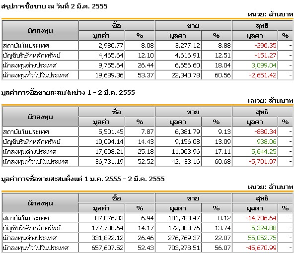|  | สรุปยอดซื้อขายต่างชาติ ณ วันที่ 02 มี.ค 2555 girdpol [2 มี.ค. 2555 18:00:59 น.]