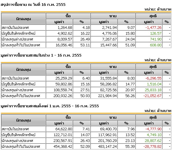 |  | สรุปยอดซื้อขายต่างชาติ ณ วันที่ 16 ก.พ 2555 girdpol [16 ก.พ. 2555 18:01:43 น.]