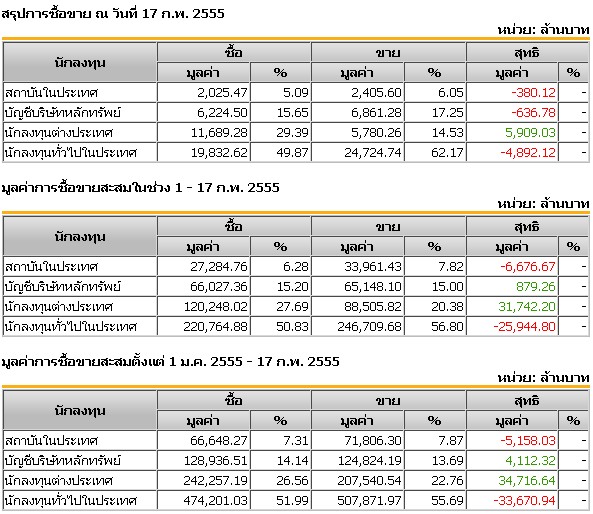 |  | สรุปยอดซื้อขายต่างชาติ ณ วันที่ 17 ก.พ 2555 girdpol [17 ก.พ. 2555 20:33:56 น.]