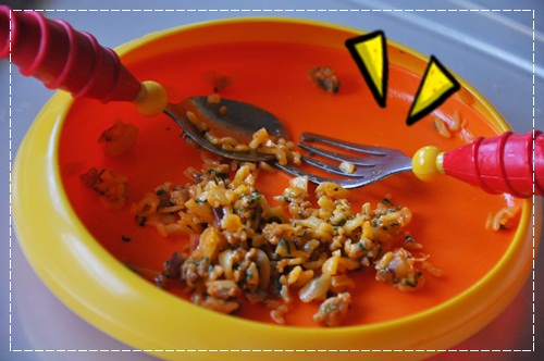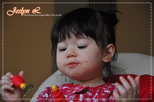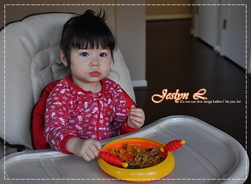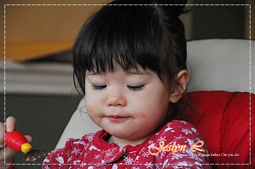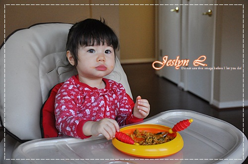 สงสัยอาหารจะหยาบ หรือไม่อร่อยก็ไม่ทราบ เพราะหนูไม่ค่อยทานเลย เล่นมากกว่าจนหนูร้องอยากจะลงจากเก้าอี้ ก็เลยต้องอุ้มลง และตามไปป้อนข้างล่างอีก ทานไปได้ไม่กี่คำ ก็เบือนหน้าหนี แม่คิดว่าอาหารคงจะหยาบไปแน่ๆ เพราะมันแห้งๆ แถม พาสต้า ก็ไม่ได้หั่นละเอียดเท่าใดนัก แถมฟันก็มีอยู่ไม่กี่ซี่ด้วย
