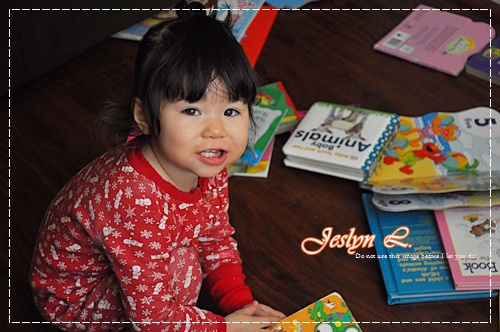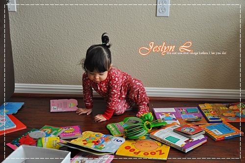 หนูลงมานั่งเล่นตรงนี้ หนูชอบนักเชียว เทหนังสือออกจากกล่อง