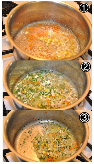 1. ตั้งน้ำซุป พอน้ำซุปเริ่มเดือด ใส่แครอทกับข้าวโพด เพราะสองอย่างนี้สุกยากกว่าอย่างอื่น