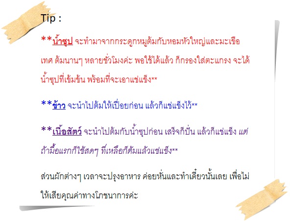 หั่นทุกอย่างเป็นชิ้นเล็กๆ ใช้น้ำซุปกระดูกหมูและข้าวต้มแช่แข็ง อย่างละ 3 ก้อน ส่วนเนื้อไก่ก้อนเดียว ตั้งไฟเบาๆ พอน้ำซุปละลายก็คนไปเรื่อยๆ จนกระทั่งน้ำเริ่มงวด แล้วก็ปิดไฟ เสร็จพิธี