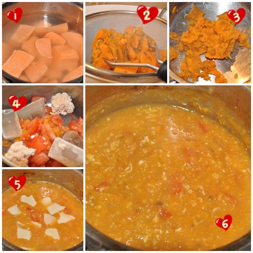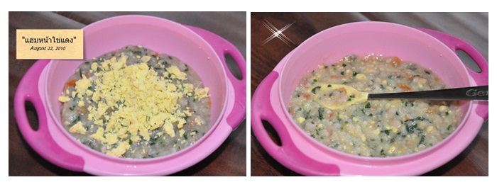เตรียมทุกอย่าง (หั่น ซอย) ตามรูปเลยนะคะ ความจริง ถ้ามีเวลาเยอะ ควรจะตั้งน้ำซุปกับข้าวต้มก่อน แต่มี่เอาสะดวกไว้ก่อน คือใส่ทุกอย่างทีเดียวรวมกันไปเลย จากนั้นก็เอาหม้อตั้ง ความจริงทุกเมนูก็ทำเหมือนกัน ต่างกันที่ส่วนผสมบ้างนิดหน่อย ตั้งไฟอ่อนๆ พอน้ำซุปละลาย ก็บดอาหารด้วยทัพพี ให้ทั่ว เพื่อให้เนื้ออาหารเละ เหมาะสำหรับเหงือกลูกมากที่สุด จนกระทั่งน้ำงวด ก็ปลง