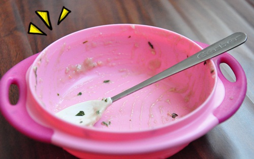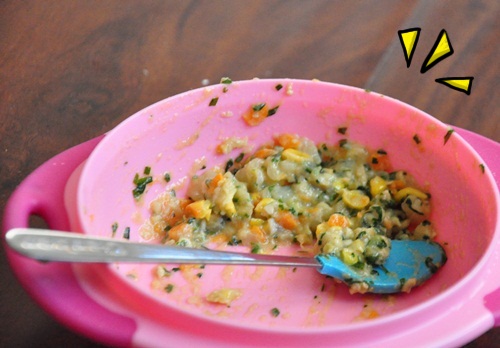 สุดท้ายก็เลยคิดว่าหนูไม่ทานแน่ๆ ก็เลยไปเอาอาหารขวดที่เหลืออยู่ในตู้เย็นนิดนึงมาป้อน ปรากฎว่าหนูทานเอาๆ มัมมี๊ก็เลยคิดเมนูนี้มันหยาบไปสำหรับหนู เพราะหนูมีฟันแค่สองซี่เอง เคี้ยวยังไม่ได้ พอเอาอาหารขวดมาป้อนหนูยังทานดีเลย ครั้งหน้าคงต้องปั่นก่อนเสริฟแล้วแหละค่ะ เสียดายจังเมนูนี้สีสวยเลย