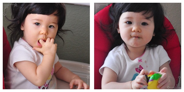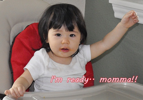 วันนี้หนูตื่นนอนมาไม่ร้องเลย ตื่นมาก็คลานมา แล้วมัมมี๊ก็ถามว่า แม่มๆ ไหม หรือก็บอกว่า แม่มๆ ตอนนั้นอาหารยังไม่เสร็จเลย หนูก็หิวมาก มัมมี๊ก็เลยจับหนูนั่งที่เก้าอี้ก่อน ก็ให้หนูทานขนมไปพลางๆ ก่อน พออาหารเสร็จก็มาเสริฟหนู ปรากฏว่าทานไป 2-3 คำ เริ่มส่ายหน้าหนีเลย สงสัยไม่อร่อยแน่ๆ