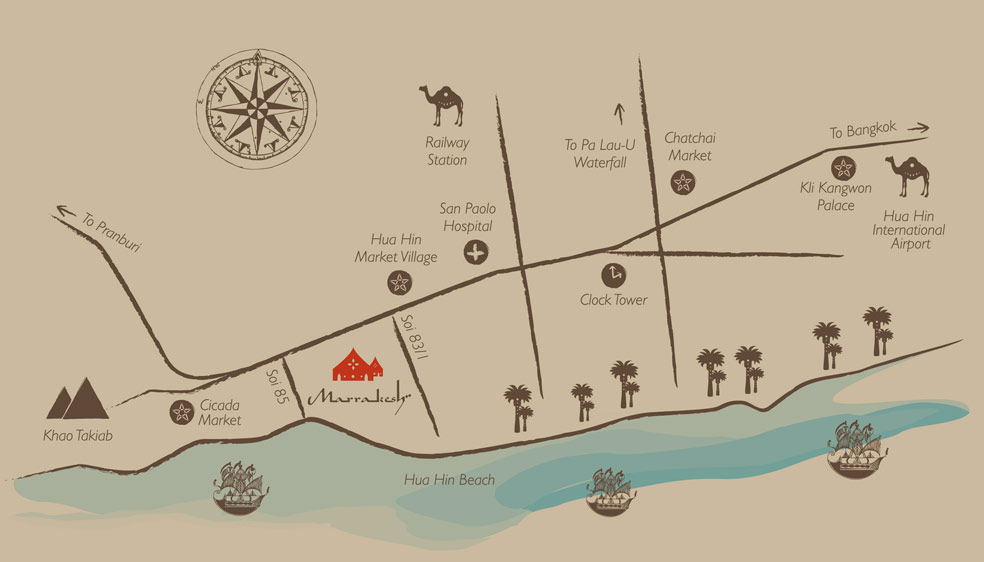 เริ่มต้นรีวิวด้วยการแนะนำที่ตั้งกันก่อน มาราเกซ อยู่เลยตลาดหัวหินลงมาทางใต้นิดหน่อย ก่อนถึงทางแยกตรงไปเขาตะเกียบกับสะพานข้ามทางรถไฟนิดหน่อยฮะ เป็นโรงแรมที่ตั้งอยู่ริมชายหาดหัวหินครับ