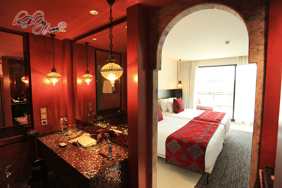 ห้องนี้เป็นห้อง Jacuzzi Suite ห้อง Type ต่ำสุดของรีสอร์ท เปิดห้องเข้าไปก็จะเจอกับภาพแบบนี้ครับ ห้องโทนสีแดง ซ้าย-ขวาจะแยกเป็นส่วนของห้องน้ำและที่เก็บเสื้อผ้า