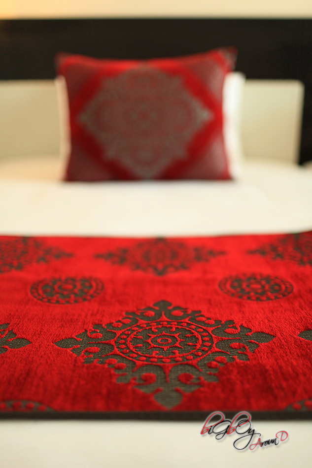 ห้องเหมือนที่ผมพักเลยฮะ ปลายเตียงมีทีวี โซฟา (ที่ห้องผมจะมีผลไม้ต้อนรับวางไว้ให้ด้วย) กระจกสีที่เห็นห้องผมก็จะเป็นสีแดงฮะ