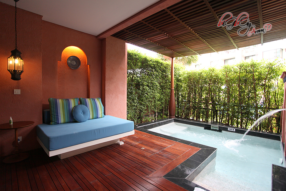 ระเบียงไม้ด้านนอกเป็น Pool อย่างที่เกริ่นไว้ฮะ มี Day Bed เหมือนห้องที่ผมพักเช่นกัน ด้านบนมีไม้ระแนงบังสายตาจากห้องข้างบนได้