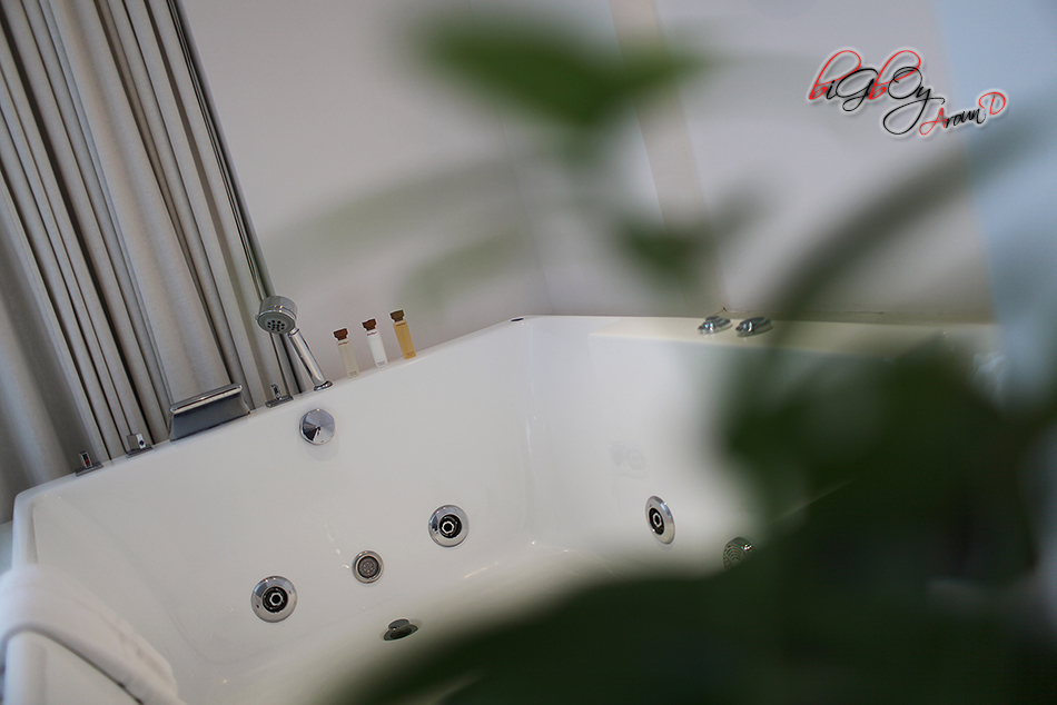 มาดูระเบียงด้านนอกกันบ้างจะมีอ่าง Jacuzzi ตั้งอยู่ฮะ (แอบใส่ฟองเยอะไปนิด) ถ้าอยากเล่นแบบส่วนตัวหน่อยก็ไม่ต้องกลัวฮะ สามารถกดสวิทช์ให้ม่านปิดลงมาได้ ถ้าเล่นช่วงค่ำก็สามารถเปิดไฟสีสวยๆในอ่างได้ฮะ
