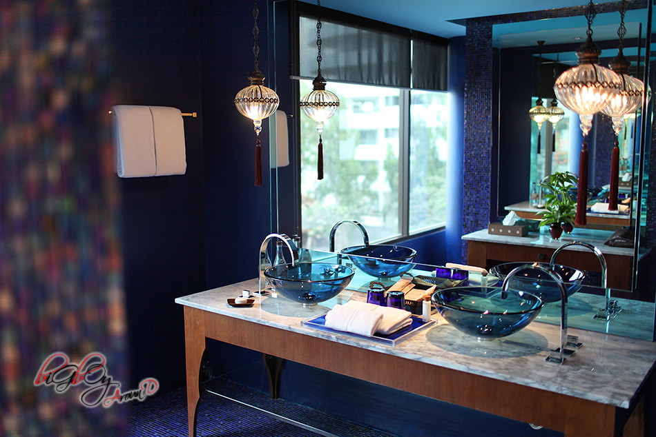 มาดูห้องน้ำกันบ้างฮะ ยังคงโทนแดงอยู่และเก๋ตรงใช้กระเบื้องโมเสคสีปีกแมงทับ มีอ่างล้างหน้าให้สองอ่างเลยครับ อุปกรณ์อำนวยความสะดวกครบครัน