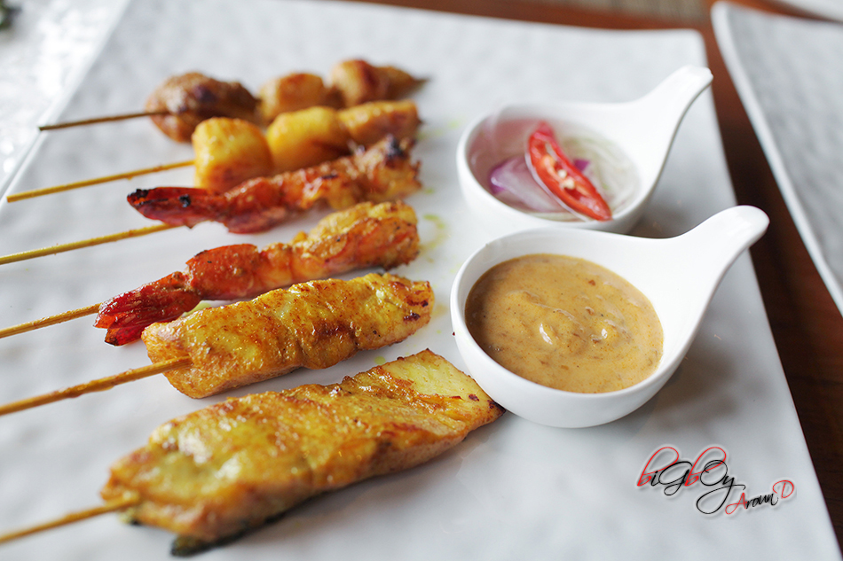 จานแรกเป็นสะเต๊ะรวมมิตรครับ ในจานจะมีเนื้อปลา กุ้งและเอ็นหอย