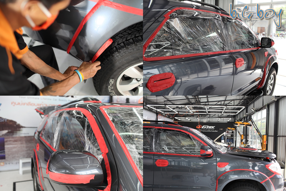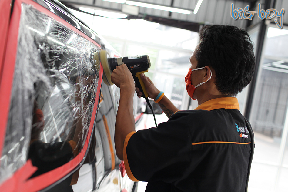 ขั้นต่อไปเป็นการเตรียมรถเพื่อขัดเตรียมผิวฮะ ทางพนักงานจะต้องเอาเทปกาวและแผ่นพลาสติกมาปิดตรงส่วนที่ไม่ต้องการขัดเพื่อที่ส่วนนั้นๆจะได้ไม่เป็นรอยตอนขัดผิวรถครับ