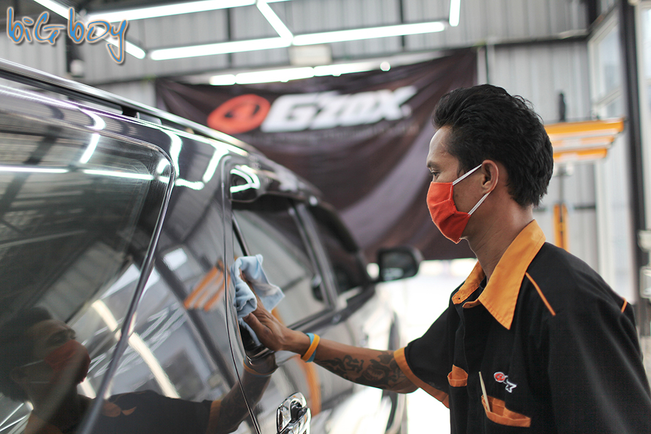 หลังจากใช้เวลาเตรียมผิวอยู่นานมากก็เสร็จขั้นตอนการขัดเรียบร้อยครับ พนักงานก็จะช่วยกันทำความสะอาดพวกฝุ่นที่เกิดจากการขัดหรือรอยน้ำยาที่ติดตามร่องต่างๆออก พอดีมีสติ๊กเกอร์เก่าๆรกๆที่กระจกหลังรถกเลยให้พนักงานช่วยเอาออกไปด้วยเลย
