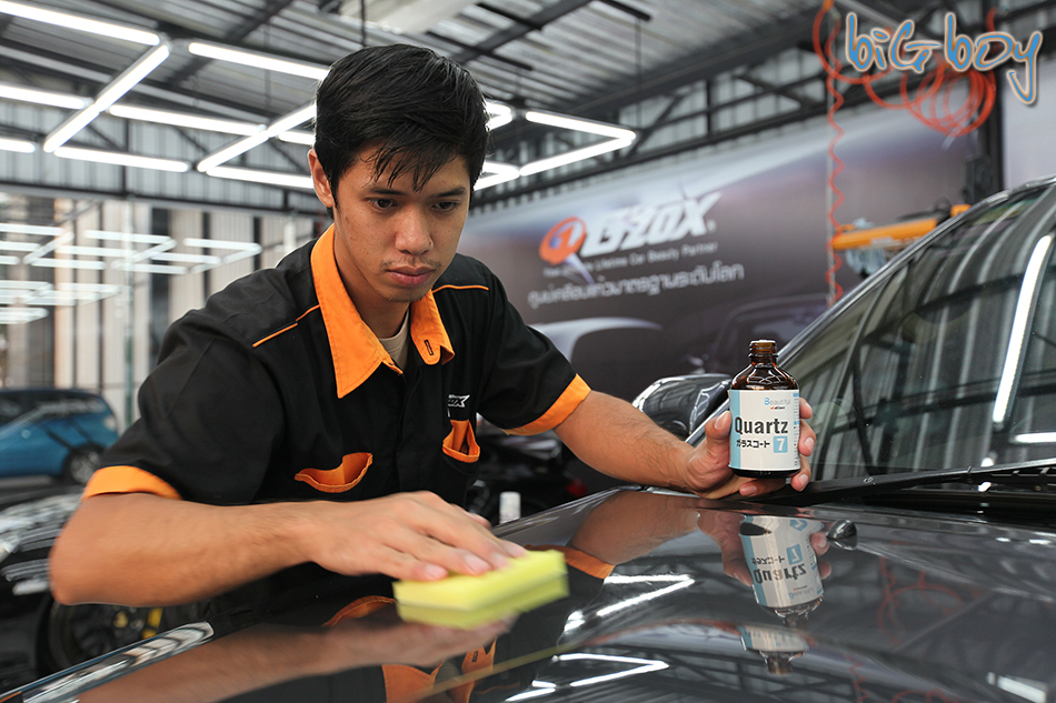 มาถึงขั้นตอนการลงน้ำยาเคลือบแก้วกันแล้วฮะ การเคลือบต้องใช้ฟองน้ำที่ให้มาเท่านั้นนะครับ ห้ามใช้ฟองน้ำแบบอื่นเด็ดขาด พนักงานก็จะค่อยๆลูบน้ำยาลงบนผิวรถ ตรงนี้ลูบได้ทั้งผิวสีรถและโคมไฟหน้าหลังครับ