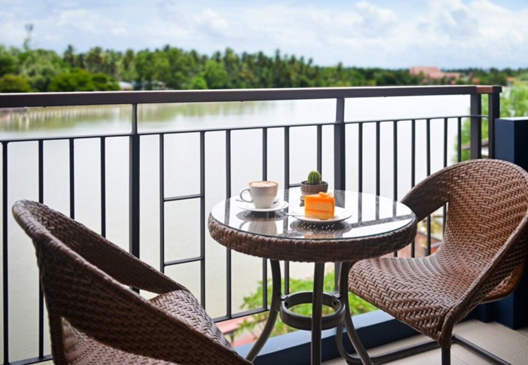 เมื่อออกไปยืนที่ระเบียง สามารถมองเห็นทิวทัศน์ริมฝั่งแม่น้ำแม่กลอง ได้ชัดเจน สวยงาม