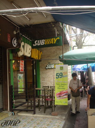 เดินย้อนกลับมาผ่าน Subway เห็นลูกค้าฝรั่งเดินเข้าร้านกันตรึม ตอนแรกเราก็กะจะกิน Subway ค่ะ แต่นึกขึ้นได้ว่าไปถึงข้าวสาร บางลำภูทั้งที ทำไมต้องมากิน Subway หว่า