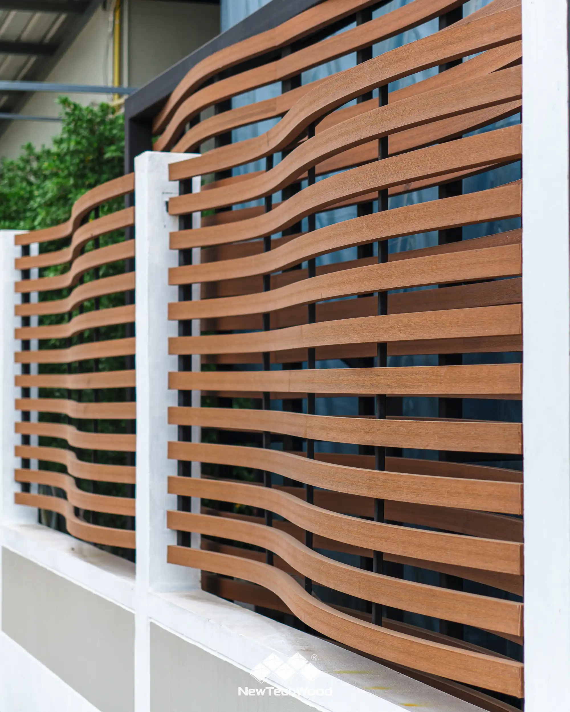 ระแนงไม้เทียม (WPC): ผลิตจากผงไม้ผสมพลาสติก ทำให้มีผิวสัมผัสและลวดลายที่ใกล้เคียงไม้จริงมากที่สุด ให้ความรู้สึกอบอุ่นและเป็นธรรมชาติ แต่ข้อจำกัดคือลวดลายอาจจะซ้ำๆ และสีอาจซีดจางเมื่อเวลาผ่านไป -