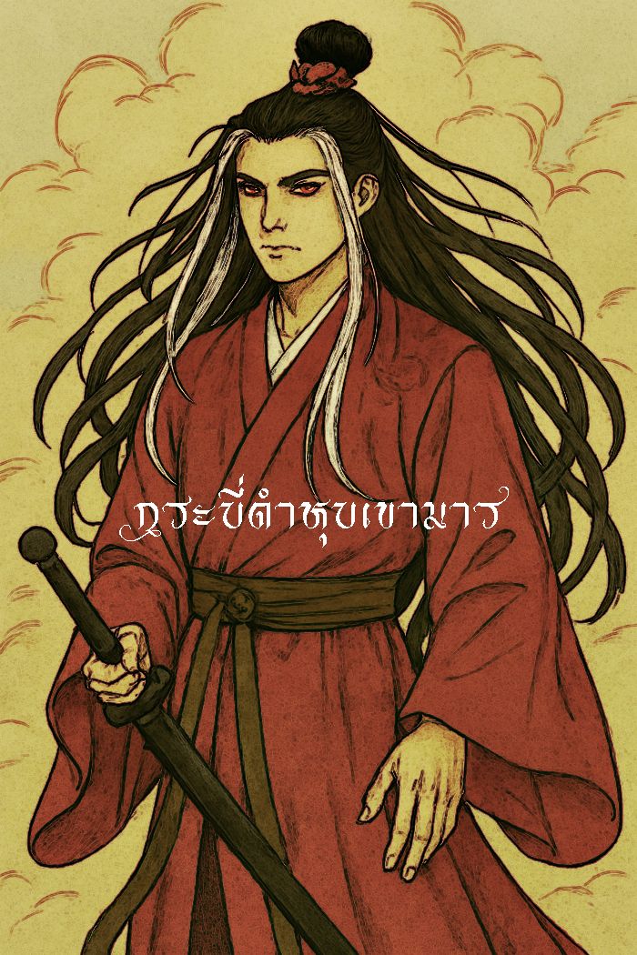 แสงจันทร์ส่องผ่านหมอกหนาลอยวน เผยให้เห็นร่างบุรุษผู้สวมชุดคลุมยาวสีแดงเข้มปักลายเมฆสีเงิน ปลายแขนเสื้อกว้างพลิ้วไหว ผ้าคาดเอวสีน้ำตาลแดง ผมดำยาวแทรกปอยผมขาว ดวงตาของบุรุษนั้นเป็นสีแดงดุจเลือด ถือกระบี่ยาวอยู่ในมือข้างหนึ่ง