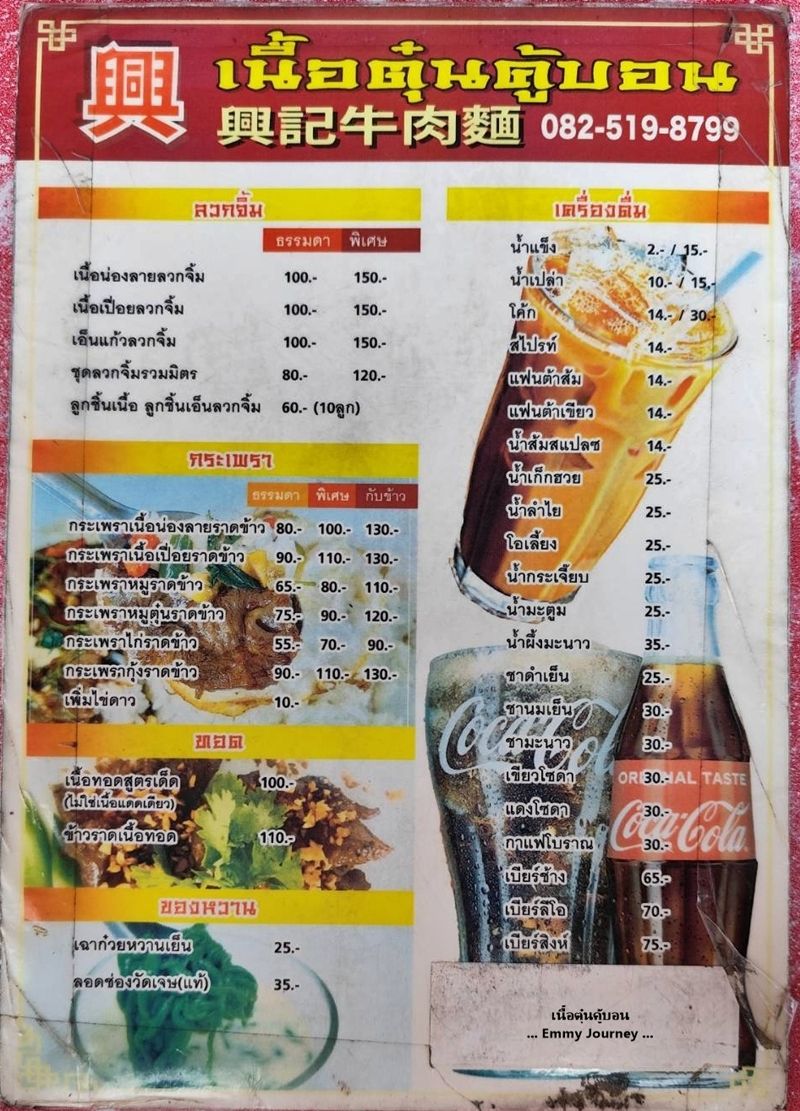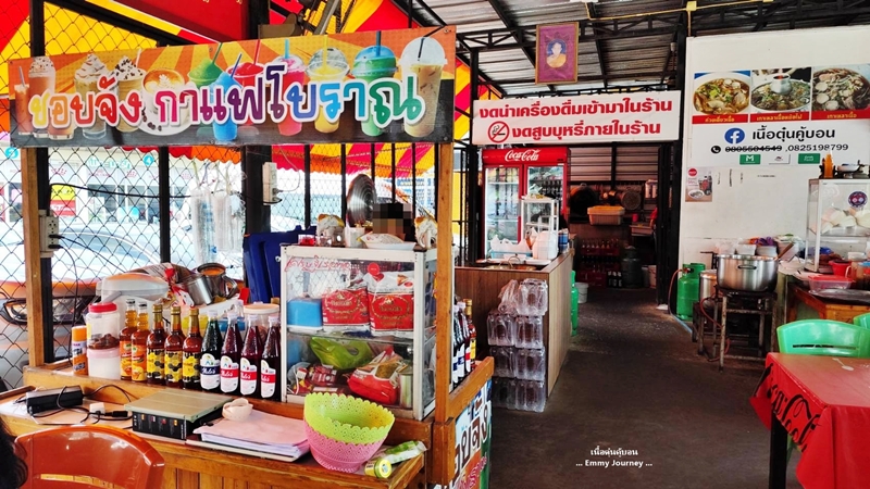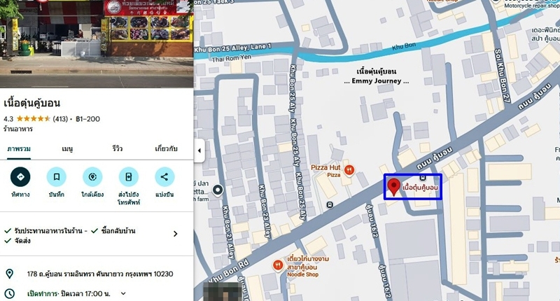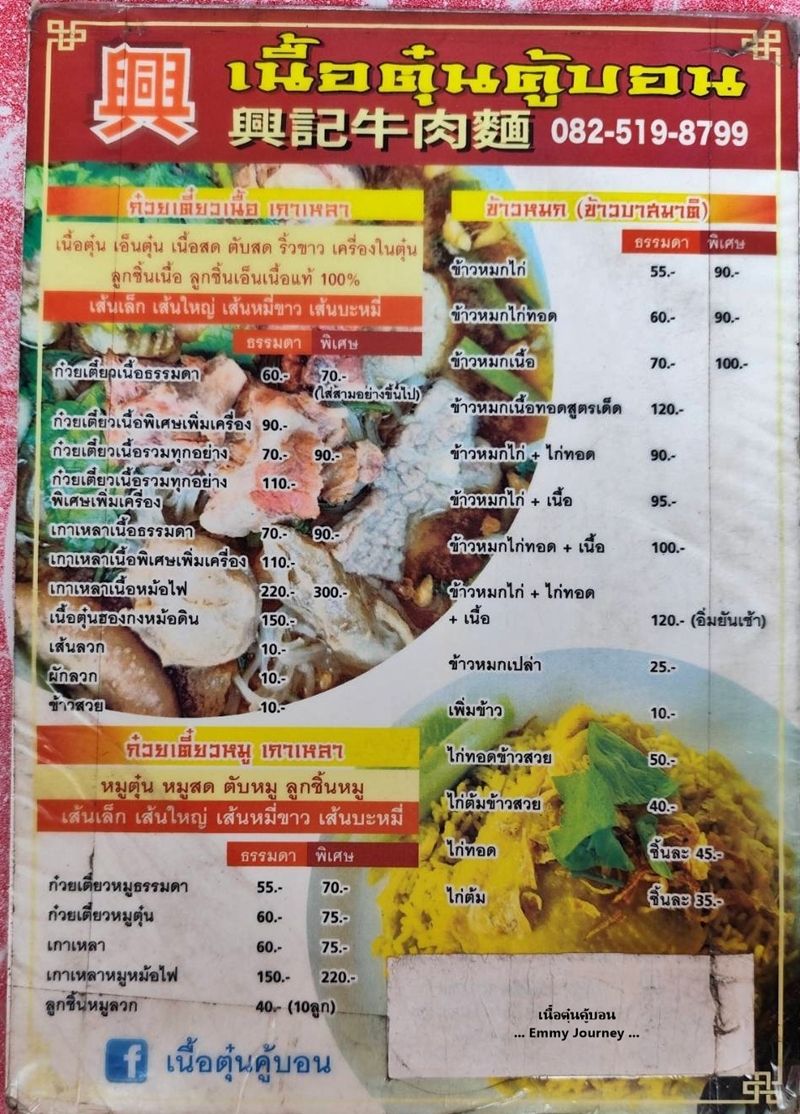 ขับรถผ่านเห็นร้านนี้เปิดอยู่ติดริมถนน บรรยากาศร้านดูโล่ง โปร่ง พอมีโอกาสเลยแวะลองชิมสักหน่อย ชื่อร้านเนื้อตุ๋นคู้บอน ตั้งอยู่ที่ถนนคู้บอน รามอินทรา กม.8 คันนายาว กรุงเทพมหานคร ร้านเปิดทุกวันตั้งแต่เวลา 8.30-17.00 น. มีที่จอดรถด้านหลังร้าน ทางร้านมีหมูตุ๋น หมูสด ลูกชิ้นหมู ข้าวหมกไก่(ข้าวบาสบัตติ) และอาหารตามสั่งด้วย มีเครื่องดื่มหลายอย่างให้เลือกด้วยมีทั้ง ชา กาแฟ น้ำอัดลม น้ำเปล่าขอบคุณภาพหน้าร้านจาก Google Mapขอบคุณแผนที่ร้านจาก Google Mapเมนูเยอะพอสมควรกะเพราเนื้อตุ๋น ไข่ดาว (ไข่ดาวฟองละ 10 บาท ) ราคา 110 บาท (เราว่าแพงไป) รสชาติกะเพราออกหวานนำเราสั่งก๋วยเตี๋ยวเนื้อเส้นเล็กเนื้อทุกอย่างพิเศษ เพิ่มเครื่องใน ราคา 90 บาท (ปริมาณน้อยไปนิด)เส้นเล็กเหนียวนุ่ม ลวกมาพอดี ไม่อืด ไม่เละจนเกินไป ลองชิมก๋วยเตี๋ยวก่อนปรุง ก๋วยเตี๋ยวน้ำซุปรสชาติดี อร่อยสั่งโค๊ก ขวดเล็ก 1 ขวดน้ำเปล่า 1 ขวดน้ำแข็ง 2 แก้วรวมจ่ายไปทั้งหมด 228 บาท