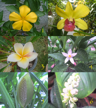 1 - ดอกบานเช้า 2 - กล้วยไม้ พันธุ์อะไรก็ไม่รู้ มีคนให้มา 3 - ลีลาวดี 4 - ดอกส้ม 5 - ไม่รู้จะเรียกมันว่าอะไรดี ดอกหรือฝัก ไม่คิดว่าต้นไม้ประดับแบบนี้จะมีไอ้นี่โผล่มาด้วย 6 - ดอกรวยไม่เลิก อันนี้ก็ไม่คิดว่ามันจะมีดอกเหมือนกัน