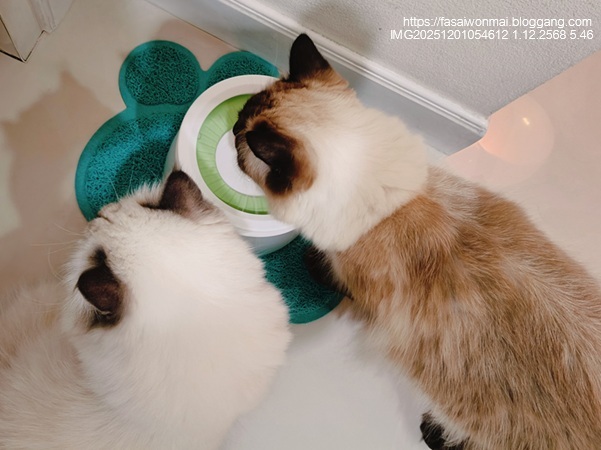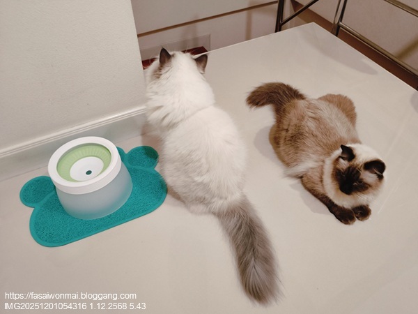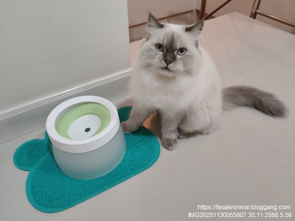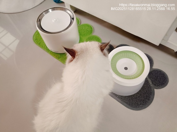 ทาสแมวก็ต้องสรรหาที่ใส่น้ำกินที่แก้ปัญหาพวกนี้ด้วย ที่ใส่น้ำอันใหม่นี้เพื่อชาลีโดยเฉพาะ เป็นแบบมีแผ่นลอยน้ำ กึ่ง ๆ น้ำพุแมว (น้ำผุด) คือน้ำจะผุดขึ้นมาตรงกลางเท่านั้น รอบ ๆ ไม่มีน้ำ ทาสแมวต้องสอนวิธีกินน้ำให้แมวด้วยนะ ต้องกดแผ่นลอยให้เห็นว่ามีน้ำนะ แล้วก็จิ้มน้ำมาแตะที่ปากแมว