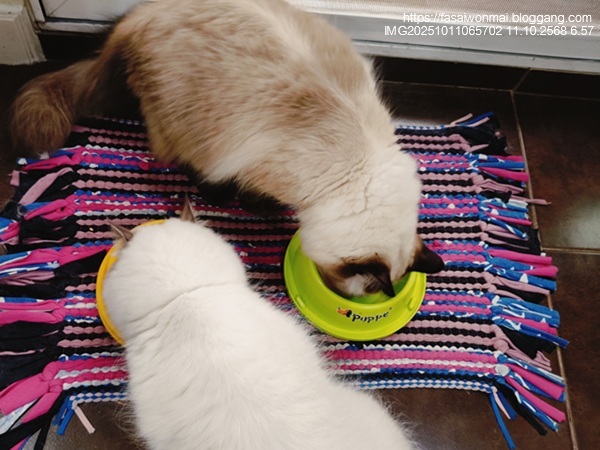 กินหมด จะเติมก็กินได้อีกนิดหน่อย เดี๋ยวนี้กินไม่มาก จริง ๆ จะงดอาหารเปียกไปเลย ก็น่าจะได้ แต่เราก็อยากให้กินเพราะมีวิตามินที่เราแอบผสมในอาหารเปียกให้กินด้วย แต่ปัญหาโลกแตกคือเห็นกิน ๆ ดีแบบนี้ก็ไม่รู้จะดีไปได้กี่วัน วันนี้กินพรุ่งนี้ก็อาจไม่กินอีก ความเปลี่ยนแปลงคือนิรันดร์ ...