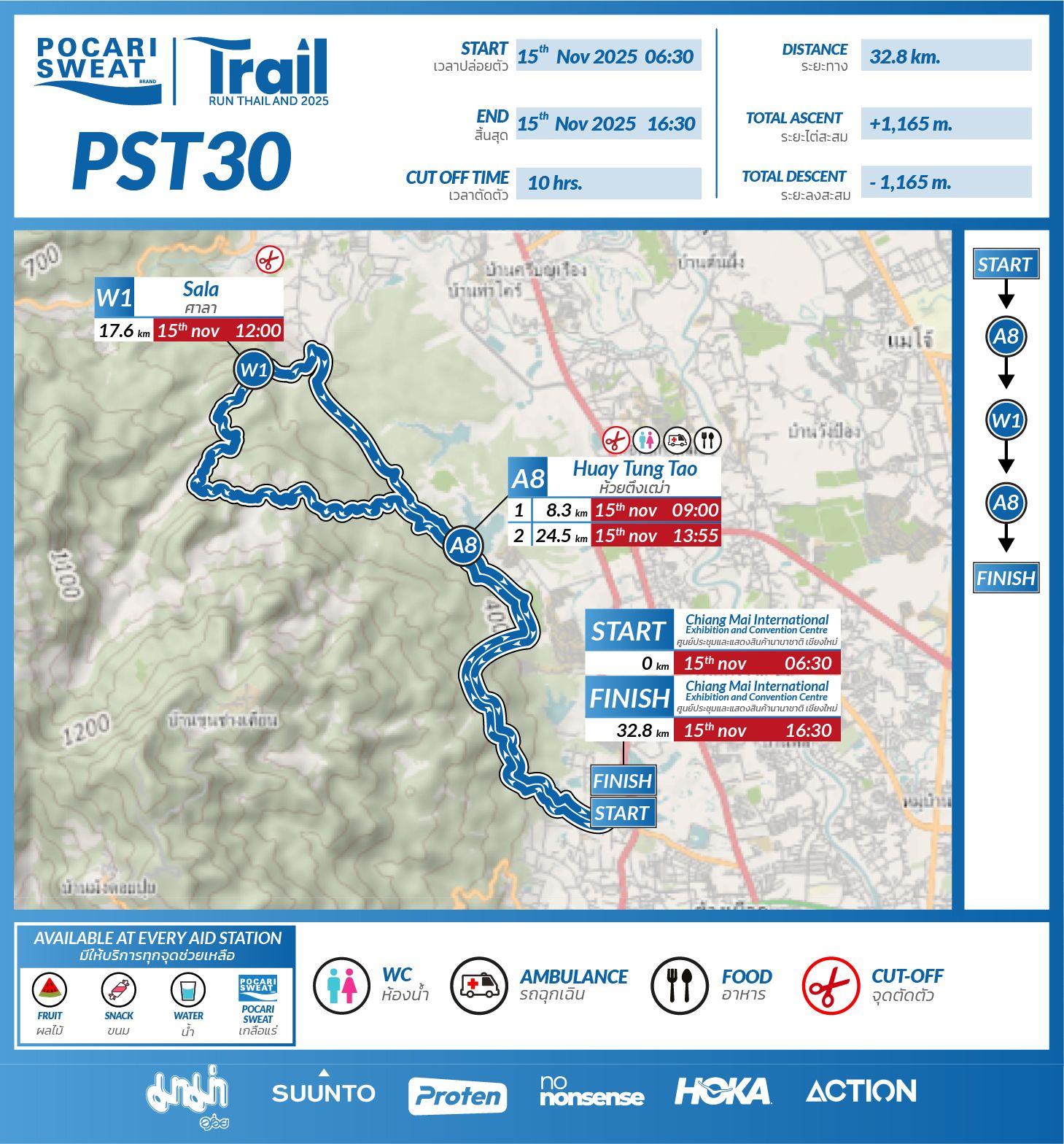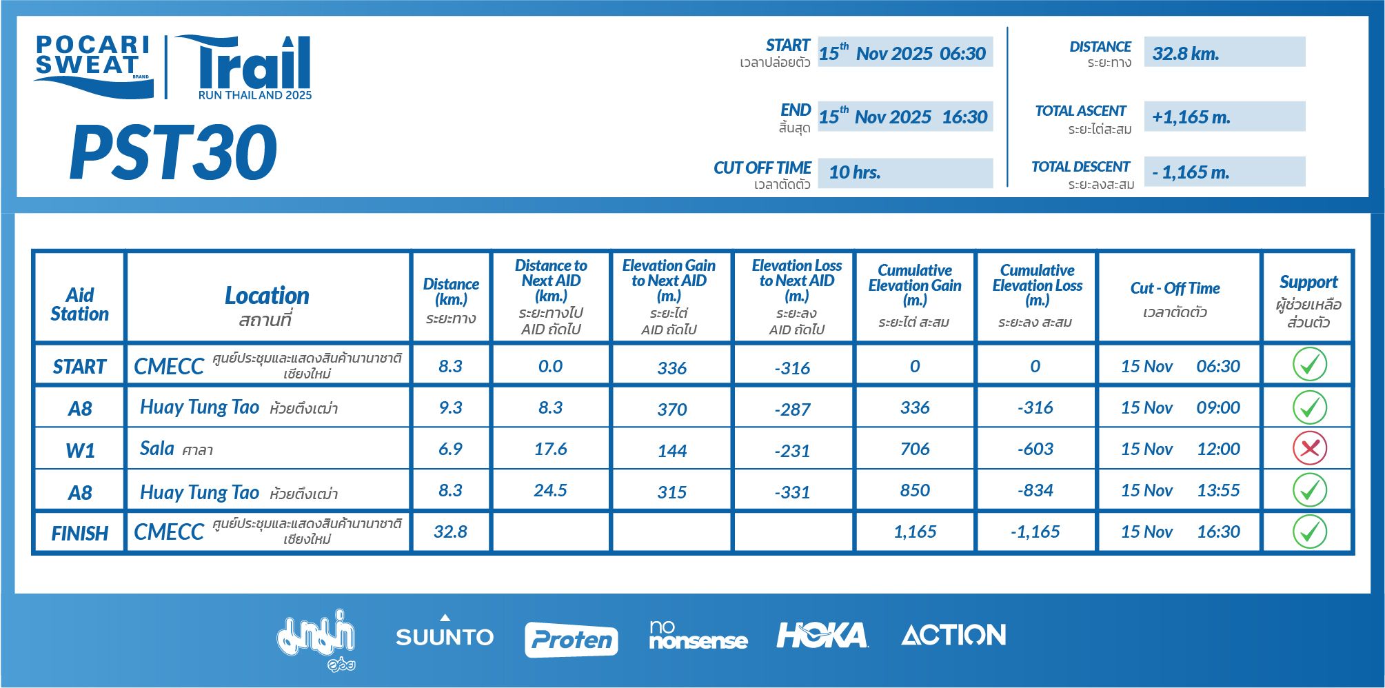 ผมเป็นคนสุดท้ายของรูทละครับ ระหว่างทางผมวิ่งอยู่คนเดียวในป่า ในใจคิดไปหลายเรื่องเลย กลัวไม่ทันคัท-ออฟ กลัวเจอสัตว์ป่า กลัวเจอคน เจอผี ทั้ง ๆ ที่มันเป็นตอนกลางวัน พอวิ่งผ่านลำธารเส้นนึง ผมล้างหน้าแล้วออกเดินต่อ ตอนนั้นผมไม่ได้คิดอะไรแล้ว รู้สึกตัวเองมีสมาธิมาก ๆ วิ่งสลับกับเดินไปเรื่อย ๆ ทันหรือไม่ทันเวลา ก็ขอทำให้ดีที่สุด ผมไปถึงจุดเช็คพอยท์ (A8) ก่อนเวลา 15 นาที เจอเพื่อนนักวิ่งเต็มเลย ผมกินข้าว เป็นมื้อที่อร่อยมากเลยครับ น่าจะหิวด้วย กินทุกอย่างที่เค้าจัดมาให้ แปบเดียวก็วิ่งกันต่อ ผมเหมือนว่าอาการปวดเข่า ปวดข้อเท้ามันจะหายละ หรือว่าคิดไปเอง