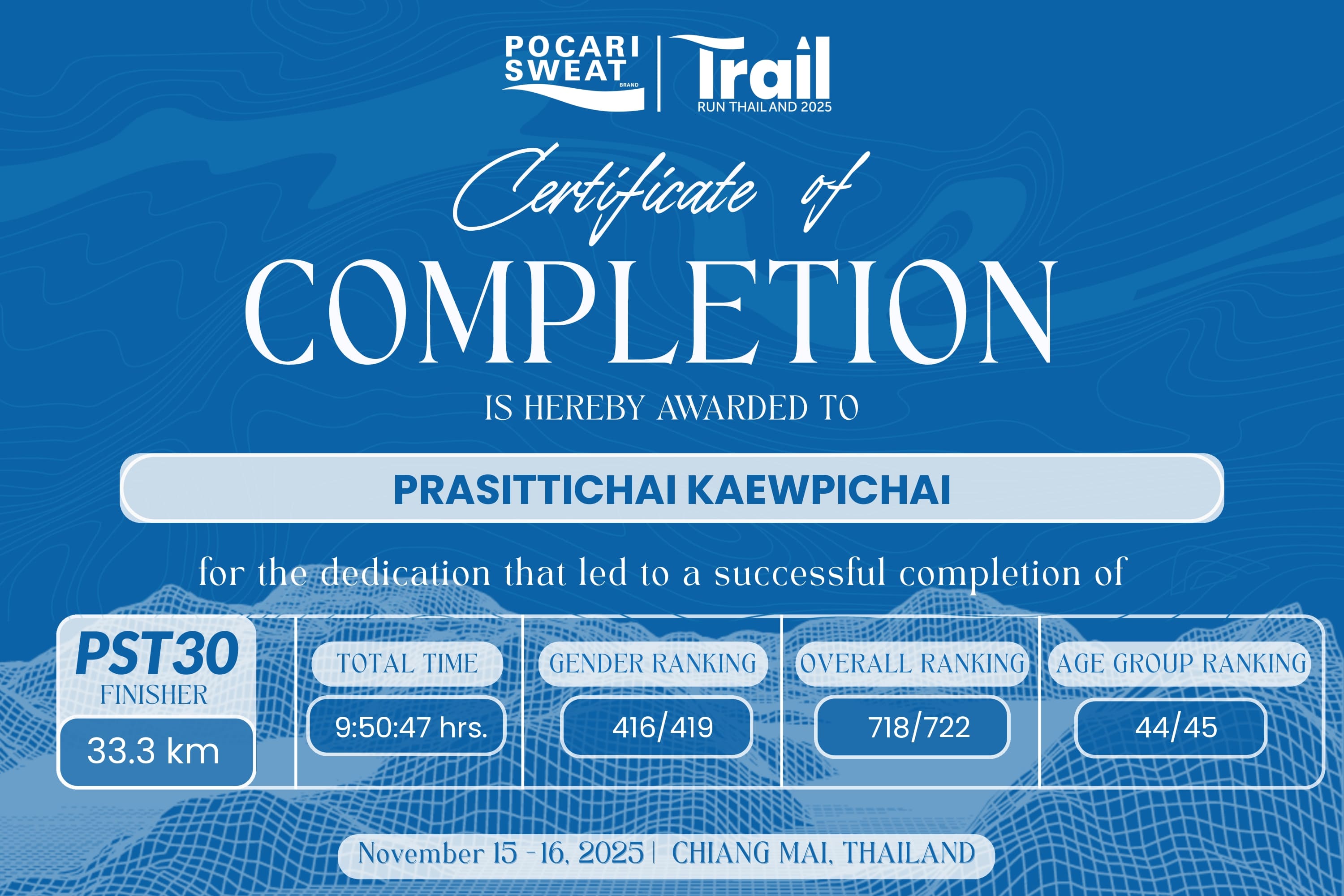 ตอนสมัครผมไม่ค่อยรู้เรื่องอะไรเกี่ยวกับวิ่งเทรลเลยครับ มีแต่อุปกรณ์ที่ผมมีครบ จากการที่ผมเคยไปวิ่งเปิดภูขึ้นภูกระดึงมา มีทั้งเป้น้ำ ไม้โพล เฮดแลมพ์ แก้วน้ำ ผมสมัครระยะ 33K ไปเพราะได้เสื้อ 2 ตัว วิ่งจบได้เสื้อ Finisher ด้วย เผอิญน้องที่ชวนผมสมัครมาบอกว่า ระยะ 33K ความชันเอาเรื่องเหมือนกันนะ ขึ้นเขา 3 ลูก กลับทางเดิม เพราะฉะนั้นรวมขึ้นเขา 6 ลูก งานเริ่มงอกละ ผมไม่เคยซ้อมเทรลเลย ซ้อมแต่ทางราบ ในใจเริ่มกลัวละ ทำไมเราไม่สมัคร 10K วะ ระยะเริ่มแรก