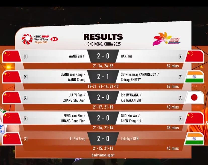 ผลการแข่งขัน มาที่การแข่งขันแบดมินตันอีกรายการนึงครับที่ฮ่องกง มีนักกีฬามาแข่งกันครบ ขาดแค่ไม่กี่คน กองเชียร์ยังเต็มสนามเหมือนเดิมครับ จีนเหมือนแข่งในบ้าน กวาดไป 5 แชมป์รวด ไม่แบ่งให้ใครเลยครับ หญิงเดี่ยว จีนชิงกันเองก็สู้กันเต็มที่ไปเลย เป็นหวัง ซึ ญี่ ที่ตีแน่นอนกว่าเอาชนะไปครับ เสียดายน้องเมย์ของไทย รายการนี้ตีดีมาก ๆ แต่แพ้หาน เยี่ยไปแบบสนุกมาก ๆ ครับ ชายคู่ คู่จีนหลังจากหลุดฟอร์มมาหลายรายการ รายการนี้ก็เอาชนะคุ่เสาโทรเลขจากอินเดียไปในเกมส์ที่สามครับ หญิงคู่ จีนคู่รถถังมือ 1 ตกรอบไป ก็ยังมีคู่เจีย ยี่ ฟานที่แบกน้องจนคว้าแชมป์ไปครับ คู่ผสม จีนชิงกันเอง ก็สนุกมาก ๆ ครับ เหมือนจะรู้ทางกันทั้งสี่คนเลย ชายเดี่ยว อาเฟงจากจีนฟอร์มหลุดไปหลายรายการเหมือนกัน นัดนี้ก็เอาชนะเซนของอินเดียไป เซนมาหลุดครึ่งเกมส์หลังทั้งสองเกมส์เลยครับรายการต่อไปเป็นไชน่าโอเพ่นตามเชียร์นักกีฬากันต่อไปครับ
