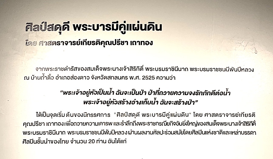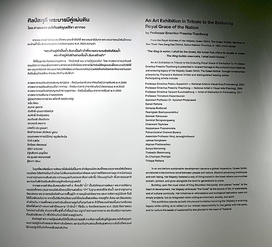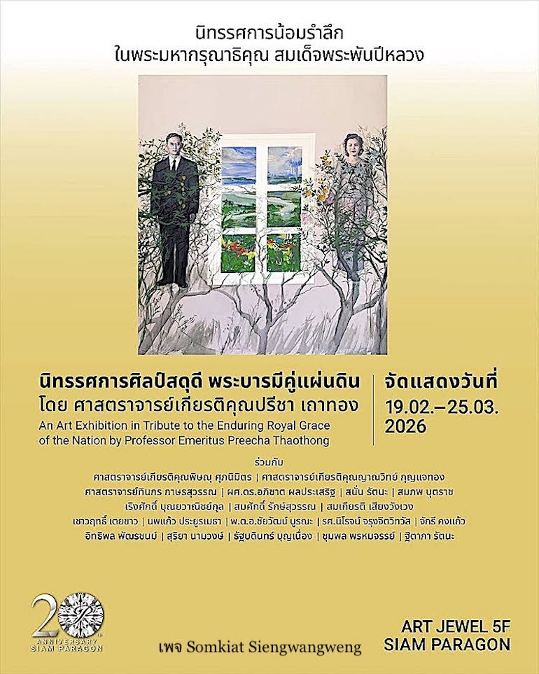 ทั้งนี้ภายในนิทรรศการจัดแสดงผลงานจากศิลปินแห่งชาติและศิลปินชั้นนำของไทย รวมทั้งสิ้น ๔๘ ผลงาน พร้อมผลงานพิเศษจากศิลปินแห่งชาติ ๒ ผลงาน ซึ่ง สยามพารากอน และศิลปินแห่งชาติทั้งสองท่านมีความตั้งใจมอบรายได้จากการจำหน่ายเพื่อสมทบแก่มูลนิธิส่งเสริมศิลปาชีพใน สมเด็จพระนางเจ้าสิริกิติ์ พระบรมราชินีนาถ พระบรมราชชนนีพันปีหลวง ผู้สนใจสามารถเข้าชมนิทรรศการได้โดยไม่เสียค่าใช้จ่าย ตั้งแต่วันนี้ถึง ๒๕ มีนาคม ๒๕๖๙ ณ Art Jewel ชั้น ๕ สยามพารากอน