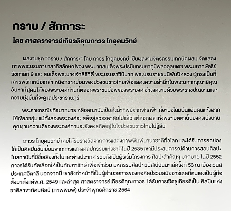 นิทรรศการ กราบ สักการะ โดย ศาสตราจารย์เกียรติคุณถาวร โกอุดมวิทย์ ศิลปินแห่งชาติ สาขาทัศนศิลป์ (ภาพพิมพ์) พ.ศ. ๒๕๖๔ นำเสนอผลงาน จิตรกรรมเทคนิคผสม ที่จัดแสดงภาพพระบรมฉายาสาทิสลักษณ์ พระบาทสมเด็จพระบรมชนกาธิเบศร มหาภูมิพลอดุลยเดชมหาราช บรมนาถบพิตร และ สมเด็จพระนางเจ้าสิริกิติ์ พระบรมราชินีนาถ พระบรมราชชนนีพันปีหลวง เพื่อแสดงความสำนึกในพระมหากรุณาธิคุณ และน้อมรำลึกถึงพระราชปณิธานอันมั่นคง ตลอดจนพระราชกรณียกิจที่เปี่ยมคุณูปการต่อผืนแผ่นดินและประชาชน