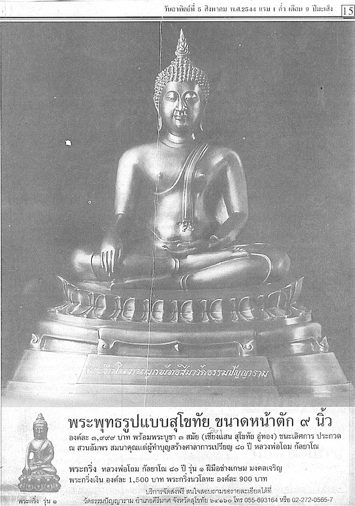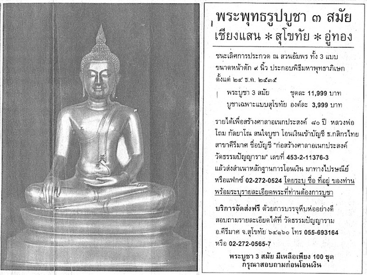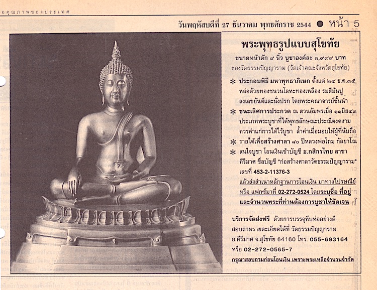 เมื่อ พ.ศ. ๒๕๔๔ เป็นช่วงวิกฤติเศรษฐกิจ รัฐบาลลดค่าเงินบาท เดคิดวิธีช่วยวัดจำหน่ายพระ วัดอยู่ถึงสุโขทัย คงไม่ค่อยมีคนไปที่วัดมากนัก แต่คนที่จะเช่าพระมีอยู่ทั่วประเทศ เดเลยคิดลงโฆษณาในหนังสือพิมพ์ ใช้เงิน ๕ แสนบาท ลงหนังสือพิมพ์ไทยรัฐ เดลินิวส์ และแนวหน้า แล้วแทนที่จะลงโฆษณาขนาดเล็ก ๆ เหมือนคนอื่น เดอยากให้คนเห็นโฆษณาชัด ๆ เลยลงโฆษณาขนาด ๑/๔ หน้า ตอนนั้นราคา ๗๐,๐๐๐ บาทต่อวัน ประมาณสิบกว่าครั้ง และมีเจ้าของคอลัมน์เกี่ยวกับพระช่วยเขียนข่าวประชาสัมพันธ์ด้วย