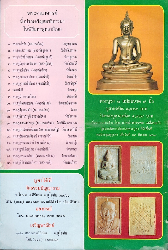 | |  | | หลังจากเดช่วยสร้างวัดที่วังทองผ่านไปหลายปี สามีภริยาชาววังทองที่เป็นเพื่อนของมา ขอให้เดช่วยสร้างโบสถ์ที่สร้างค้างไว้ถึง ๒๐ ปีของวัดธรรมปัญญาราม จ.สุโขทัย เดก็ไปช่วย โดยหาเงินด้วยการสร้างพระฉลองงานตัดลูกนิมิต สร้างโบสถ์เสร็จก็นำเงินที่เหลือมาสร้างศาลา จ้างคุณประเสริฐ ช่างรับเหมาก่อสร้างฝีมือดีที่รู้จักกับเดมานาน ให้มาสร้างตัวอาคาร ส่วนอื่น ๆ จ้างช่างจากที่อื่นมาทำ