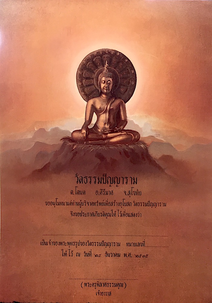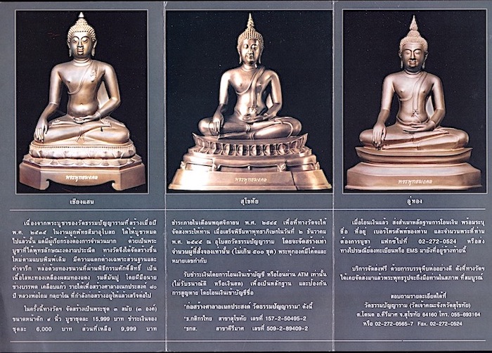 อัญเชิญพระพุทธรูปบูชาของอีกวัดที่เดเคยสร้างไว้มาให้เพื่อน ๆ ชมค่ะ มี ๓ ปาง คือ เชียงแสน สุโขทัย และอู่ทอง จัดสร้างเมื่อปี พ.ศ. ๒๕๔๔ นำเงินไปสร้างโบสถ์และสิ่งก่อสร้างอื่น ๆ ของวัดธรรมปัญญาราม จ.สุโขทัย พระมีพุทธลักษณะที่งดงามมาก สร้างออกมาสองครั้งก็มีคนสั่งจองจนหมดเกลี้ยง เดคิดจะสร้างพระอีกเป็นรอบที่สาม แต่มีเหตุให้ไม่ได้ทำ เรื่องราวค่อนข้างยาวหน่อย ค่อย ๆ อ่านกันไปจ้า
