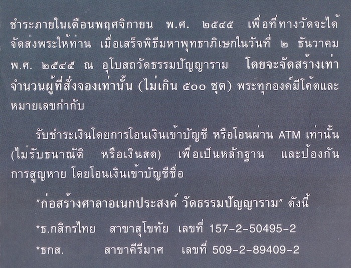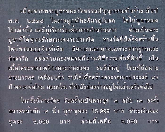คณะที่จะสร้างพระแทนมี ๕ ฝ่ายร่วมลงหุ้นกัน คิดสร้างพระอย่างที่เดทำ คิดว่าถ้าเป็นพระของวัดธรรมปัญญารามแล้ว ยังไงก็ต้องมีคนเช่ามากแน่ ๆ เดบอกว่าคนที่จะเช่าพระราคาสูงแบบนั้น พระต้องมีพุทธลักษณะที่งดงาม ถ้าสร้างออกมาไม่งามและไม่กล้าลงโฆษณานสพ.เหมือนที่เดทำ คงหาคนเช่าพระยากแน่ ปรากฏว่า มีคนมาจองพระแค่คนเดียวเอง ที่แย่กว่าคือ ตอนหลังมาขอเงินคืนเพราะเห็นองค์พระแล้วไม่ถูกใจ สุดท้าย จำหน่ายพระไม่ได้สักองค์ สรุปแล้ว หุ้นส่วนทั้งห้าคนต้องจ่ายเงินค่าสร้างพระเป็นรถปิคอัพคนละคัน