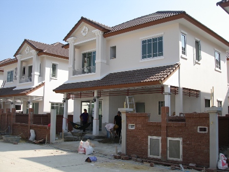 วันนี้แวะเอาเงินดาวน์งวดที่สองไปจ่ายค่ะ แต่ยังไม่ทันจ่ายเงิน เจอน้องเซลล์ที่กำลังพาเจ้าของบ้านอีกรายไปดูบ้านเค้า ตะโกนถามมาจากรถกอลฟ์ว่า " พี่คะ พี่ไปดูบ้านเลยไหมคะ เด๋วหนูได้พาไปพร้อมกันเลย "อยากเห็นบ้านตัวเองจะแย่แล้วล่ะค่ะ เลยกระโดดขึ้นรถตามน้องเซลล์ไป นั่งไปเรื่อยๆ พอถึงแปลงเรา (แปลงบ้านเราถึงก่อน) เราก้อกระโดดลงล่ะค่ะ บอกน้องเซลล์ว่าเด๋วแวะมารับพี่กลับหน่อยแล้วกันพอเห็นบ้าน เย้ๆๆ เริ่มมีรูปมีร่างเป็นบ้านแล้วล่ะ ทาสีรองพื้นแล้ว ทำฝ้าเพดานแล้ว ยืนมองแล้วแห๋มมมม บ้านใครกันเนี๊ยยย สวยจังเลยย อันนี้บ้านมุมเอียงๆค่ะถัดมาดูบ้านแบบมุมตรงๆบ้างค่ะช่างกำลังทาสีรองพื้นนอกบ้านอยู่ค่ะนี่อีกคนนึงค่ะเข้ามาดูในบ้านบ้าง นี่ห้องครัวค่ะ ยังไม่ได้ปูกระเบื้องพื้นเลย กะว่าพอโอนเสร็จ จะให้ช่างเค้ามาปูกระเบื้องที่ผนังเพิ่มค่ะอันนี้พี่ช่างกำลังปูกระเบื้องห้องน้ำชั้นล่างค่ะไปดูชั้นสองกันบ้างค่ะ อันนี้ว่าที่ห้องพระอันนี้ห้องนอนใหญ่ค่ะ มีฝ้าหลุมด้วยล่ะยังอยู่ในห้องนอนใหญ่ค่ะ แต่หันหน้ามาทางส่วนแต่งตัว กับห้องน้ำในห้องนอนใหญ่ห้องน้ำในห้องนอนใหญ่ค่ะ โทนสีน้ำตาลครีม สวยมากเลยฝนังอีกด้านนึงเป็นสีครีมสวยค่ะห้องน้ำชั้นบนอีกห้องนึง ยังไม่ได้ปูกระเบื้องค่ะใช้กระเบื้อง Cotto ทั้งพื้นและผนังค่ะลงมาข้างล่าง มองจากหน้าบ้านเข้าไปในห้องรับแขกค่ะรูปหน้าจั่วของบ้านค่ะเนี่ยล่ะค่ะบ้านเราในสัปดาห์นี้ล่ะ น้องเซลล์บอกว่า พี่ขา สิ้นเดือนหน้าก็เสร็จแล้วค่ะพี่ 5555+ ดีใจค่ะดีใจมาดูบรรยากาศรวมๆบ้างค่ะ อันนี้ทางเข้าจากถนนใหญ่ค่ะ ตรงที่เห็นแนวต้นปาล์มไปนั่นล่ะค่ะ ถนนราชพฤกษ์หันมาดูจากรูปบน ก็เป็นทางเข้าหมู่บ้านค่ะ พี่ยามอยู่ตรงนี้ล่ะถนนเมนในโครงการค่ะ