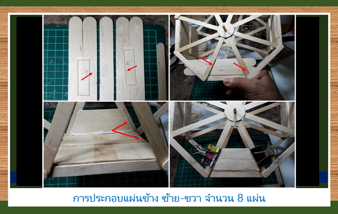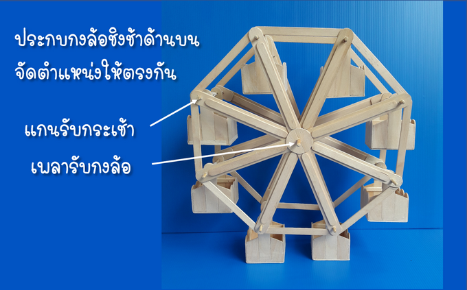 ![]() ![]() DIY โมเดลไม้ไอติม ต้นแบบโครงงานวิทยาศาสตร์ เรื่องล้อและเพลา ซึ่งสามารถนำไปดัดแปลงได้หลายแบบ เช่น ขาตั้งประชาสัมพันธ์ อัลบัมกรอบรูป กังหันชัยพัฒนา และชิงช้าสวรรค์ เป็นต้น ![]() ในบทความนี้ จะสาฑิตการทำโมเดลชิงช้าสวรรค์ แบบ 8 กระเช้า ซึ่งมีลักษณะเหมือนการทำกงล้อของกังหันชัยพัฒนา ทำกงล้อเหมือนกัน 2 ชุด ประกบซ้อนกัน ใช้สว่านเจาะรูเท่าขนาดไม้เสียบลูกชิ้น ที่ปลายแขนด้านวงล้อ สำหรับเสียบแกนแขวนกระเช้า และสว่านขนาดเท่าไม้ตะเกียบเจาะรูตรงกลางแป้นวงกลม สำหรับเสียบแกนเพลา ![]() ขาตั้งรับเพลาชิงช้า ใช้ไม้ไอติมใหญ่ ปะกบสองอันเพิ่มความแข็งแรง ทำเป็นกรอบสี่เหลี่ยมด้านล่าง และกรอบสามเหลี่ยมด้านบน เจาะรูเสียบเพลาชิงช้า วัดระยะห่างประมาณ 4 1/2 นิ้ว ทำแป้นตั้งด้านล่าง ดังรูป ![]() การประกอบโครงชิงช้ากับขาตั้ง มีไม้เสียบลูกชิ้นยึดกงล้อทั้งสองด้านเข้าด้วยกันจะแน่นพอดี ตรงกลางเป็นแกนเพลา ทั้งหมดจะลงตำแหน่งเสมอกัน ![]() นำกระเช้าที่ทำไว้มาเสียบกับแกนทั้ง 8 ชุด เสียบแกนเพลาตรงกลาง ![]() นำกงล้ออีกชุดมาปะกบด้านบน ค่อยๆ เสียบให้ตรงตำแหน่งที่เจาะไว้ ปรับองศาให้ตั้งฉากและความกว้างเสมอกันทั้ง 8 จุด จึงหยอดกาว ![]() นำกงล้อชิงช้ามาประกอบเข้ากับขาตั้ง กงล้อชิงช้ามีความกว้าง 10 นิ้ว เมื่อประกอบกันแล้วจะสูง 15 นิ้ว ![]() ทดลองใช้มือหมุน ชิงช้าจะหมุนวนตามเข็มนาฬิกา กระเช้าชิงช้าจะต้องไม่ติดขัด ![]() ดูคลิปบน Youtube : https://www.youtube.com/watch?v=5XUkVZBpo50 ![]() ต้องการรายละเอียดในแต่ละขั้นตอน ติดต่อสอบถามได้ครับ ยินดีเสมอ สะดวกพูดคุยทาง Line เบอร์เดียวกับโทรศัพย์ ครับ ลุงแดง ไม้ไอติม 3 เมษายน 2565 DIY350 โครงงานกังหันไม้ไอติม