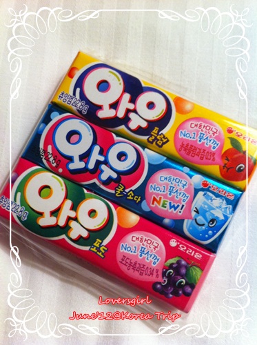 อ๋อ แล้วก็ส่งท้ายค่ะ มีอีกอย่างเกือบลืมลง หมากฝรั่งจากเกาหลีค่ะ หลายคนอาจสงสัยเธอไปเกาหลีซื้อหมากฝรั่งเนี่ยนะ เรื่องมันมีอยู่ว่า ... ก่อนไป เราถามหลานสาวตัวป่วน (4ขวบปลายป ว่าน้าไปเกาหลี หนูอยากได้อะไรมั้ยคะ หลานเราคิดอยู่นานนนนน ก่อนจะตอบว่า หนูอยากได้ทอฟฟี่รสโค้กค่ะ เอิ่มมมมมม เอางั้นหรอลูก อยากได้อะไรอีกมั้ย หลานสาวตอบเสียงอันมั่นใจว่า ไม่ค่ะ ด้วยความพยายามของน้า บวกกับเวลาอันจำกัด น้าเลยสอยหมากฝรั่งมาให้แทน ให้หลานสาวก็ปลาบปลื้มกันไป