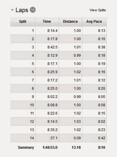 I gave it all I had at this point.  I was smiling running through the finish line. My Garmin showed 1:48:53, and my official time was 1:48:51. I was super happy with the result. I did it!!! I ran sub 1:50. I felt that I ran the race smartly. I even had energy left to sprint the last 0.1 miles to the finish line. I may be able to run little faster if I didn't slow down too much at mile 3, but I'm definitely happy with this race.The weather was perfect, the course was nice, volunteers were very helpful, and I did beat my PR by 4 minutes.  Here are the splits from my Garmin. The result from the race; I got 125/983 (overall female), 26/150(AG),time 1:48:51, pace 8:19. About 6 weeks before the MCM, I feel more confidence that I will be able to run sub-4 marathon. :)