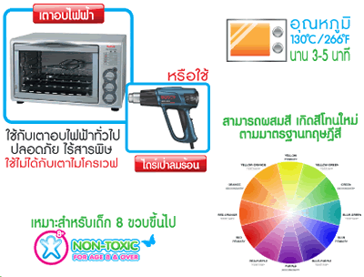 เรื่องเวลาในการอบ... มันใช้เวลาอบน้อยมากกกกกกกกกกก ปรกติพวก fimo นี่อบลืมไปเลย แต่ดินตัวนี้อบไม่ถึง 5 นาทีก็เสร็จแล้ว ถ้าชิ้นงานหนาหน่อยก็นานขึ้นอีกนิด ไอ้เราก็เผลอไปเล่นกับน้องหมาทุกครั้งที่อบดิน ก็จะมีอาการไหม้ขอบๆมาให้เห็น หรือไม่ก็ไหม้มันทั้งบาง เหม็นไปทั้งบ้าน ฮ่าๆๆๆ ที่สำคัญห้ามใช้ไมโครเวฟนะคะ... ส่วนเอาดินไปอบในเตาอบแล้ว อบอาหารต่อได้ไหม ข้อนี้ไม่รู้ค่ะ แต่ไม่เคยเอาอาหารไปอบอีกเลย เพราะเราทำมันไหม้หลายรอบ สารเคมีตกค้างเยอะแหงๆ...