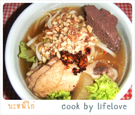 "บะหมี่ไก่"อีกเมนูนึงที่อยากแนะนำให้ลองทำทานกันค่ะ ทำง่ายๆ ไม่ยุ่งยากประหยัดตังค์และอิ่มท้องแน่ๆล่ะ ถ้าตามนี้ล่ะก็ชามยักษ์ๆ 4 ชามค่ะ ...ไปทำกันเลยค่ะส่วนประกอบ- ไก่ชิ้นใหญ่ 4 ชิ้น (ตามชอบค่ะ น่อง/สะโพก/อื่นๆ)- เลือดไก่ 1 ก้อน- รากผักชี/ กระเทียม/พริกไทย โขลกรวมกัน 1 ช.- อบเชย 2 ก้านเล็ก- โป้ยกั๊กประมาณ 1 ช้อนพูน- น้ำตาลกรวด 1 ช้อนพูน (ถ้าใครชอบหวานเติมได้อีกตามชอบค่ะ)- หัวไชเท้า 1 หัว- บะหมี่ 1 ห่อ- คึ่นช่าย 1 ต้น+ ต้นหอม 1 ต้น หั่นไว้โรยตอนสุดท้าย- กระเทียมเจียว 2 ช.- ถั่วงอก 1/2 ถ.- ผักกาดหอม 1 ต้น- ซีอิ้วหวาน 1 ช.- ซีอิ้วขาว 1/3 ถ.- น้ำซุปโครงไก่ 1 1/2 ลิตร- น้ำมันพื้ช 2 ช.- ซอสปรุงรส 1 ช....วิธีทำ...1. ล้างไก่ให้สะอาด เอาไก่ไปหมักกับรากผักชีฯ ที่เราโขลกไว้แล้ว ตามด้วยซอสปรุงรส ตั้งกระทะใส่น้ำมัน ตามด้วยไก่ ผัดไก่ให้หอม พอหนังไก่ตึงๆก็เติมนำ้ำซุปลงไป2. ล้างแล้วปอกเปลือกหัวไชเท้า หั่นเป็นชิ้นๆ ใส่ลงไปในหม้อต้มไก่ห่อโป็ยกั๊กกับอบเชยด้วยผ้าขาวบางมัดด้วยด้ายให้แน่นใส่ลงไปในหม้อลดไฟลงให้เหลือกลางถึงอ่อนปรุงรสด้วยซีอิ้วขาว ซีอิ้วหวาน น้ำตาลกรวด ใส่เลือดไก่หั่นชิ้นลงไป ปิดฝาทิ้งไว้ประมาณ 25 นาที3. ต้มน้ำให้เดือด นำบะหมี่ลงไปต้มใส่สุก ตักชิ้นแช่น้ำเย็นสักครู่ แล้วใช้กระชอนตักให้บะหมี่สะเด็ดน้ำ นำมาใส่ชามคลุกด้วยกระเทียมเจียว4. เมื่อน้ำซุปและไก่ของเราเได้ทีดีแล้ว ไก่นุ่มดี ชิมรสน้ำซุปตามชอบ ตั้งหม้อใส่น้ำพอสมควร ลวกถั่วงอกหรือผักอื่นตามชอบ ตักใส่ชามไปทานได้แล้วค่ะ ใส่ผักลวกลงในชาม ตามด้วยเส้นบะหมี่ ผักกาดหอม โรยหน้าด้วยคึ่นช่ายกะต้นหอม ตักไก่ ตามด้วยน้ำซุป...ยกเสริ์ฟชอบจืดๆ ก็ไม่ต้องปรุงชอบแบบจัดจ้าน ก็เติม พริก/ถั่วลิสงคั่วป่น/ น้ำส้มลงไป ตามใจคนทานเลยค้า